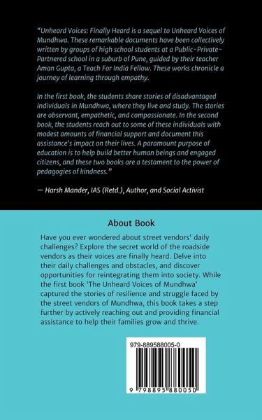 Have you ever wondered about street vendors' daily challenges? Explore the secret world of the roadside vendors as their voices are finally heard. Delve into their daily challenges and obstacles, and discover opportunities for reintegrating them into society. While the first book 'The Unheard Voices of Mundhwa' captured the stories of resilience and struggle faced by the street vendors of Mundhwa, this book takes a step further by actively reaching out and providing financial assistance to help their families grow and thrive.