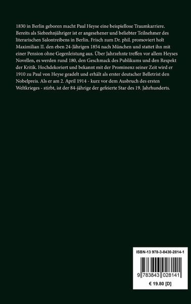 Paul Heyse: Unheilbar. Gesammelte Novellen Band 8 Aus: Meraner Novellen. 5. Sammlung, Hertz, Berlin, 1864. Vollständige Neuausgabe mit einer Biographie des Autors. Herausgegeben von Karl-Maria Guth. Berlin 2015. Umschlaggestaltung von Thomas Schultz-Overhage unter Verwendung des Bildes: Franz Seraph Hanfstaengl, Paul Heyse, um 1860 (Ausschnitt). Gesetzt aus Minion Pro, 11 pt. Über den Autor: 1830 in Berlin geboren macht Paul Heyse eine beispiellose Traumkarriere. Bereits als Siebzehnjähriger ist er angesehener und beliebter Teilnehmer des literarischen Salontreibens in Berlin. Frisch zum Dr. phil. promoviert holt Maximilian II. den eben 24-Jährigen 1854 nach München und stattet ihn mit einer Pension ohne Gegenleistung aus. Über Jahrzehnte treffen vor allem Heyses Novellen, es werden rund 180, den Geschmack des Publikums und den Respekt der Kritik. Hochdekoriert und bekannt mit der Prominenz seiner Zeit wird er 1910 zu Paul von Heyse geadelt und erhält als erster deutscher Belletrist den Nobelpreis. Als er am 2. April 1914 - kurz vor dem Ausbruch des ersten Weltkrieges - stirbt, ist der 84-jährige der gefeierte Star des 19. Jahrhunderts.