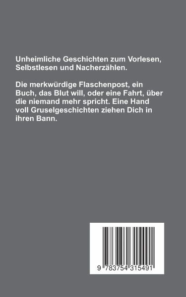 Unheimliche Geschichten zum Vorlesen, Selbstlesen und Nacherzählen. Die merkwürdige Flaschenpost, ein Buch, das Blut will, oder eine Fahrt, über die niemand mehr spricht. Eine Hand voll Gruselgeschichten ziehen Dich in ihren Bann.