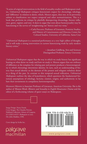 "A series of original interventions in the field of sexuality studies and Shakespeare studies, Unhistorical Shakespeare critiques historicism's respect for chronology, teleology, and difference in relation to desire, which, Menon argues, does not, in its perversity, submit to classification, nor respect temporal and other normativizations. This is a book that performs its critique by playfully disrespecting chronology, literary influence, genre, register, and tone. It dares to argue that texts about homosexuality may be functioning in the service of straightening out history and vice versa." - Carla Freccero, Professor of Literature, Feminist Studies, and History of Consciousness and Director, Center for Cultural Studies, University of California, Santa Cruz