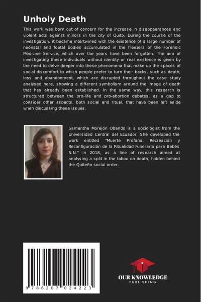 This work was born out of concern for the increase in disappearances and violent acts against minors in the city of Quito. During the course of the investigation, it became intertwined with the existence of a large number of neonatal and foetal bodies accumulated in the freezers of the Forensic Medicine Service, which over the years have been forgotten. The aim of investigating these individuals without identity or real existence is given by the need to delve deeper into these phenomena that make up the spaces of social discomfort to which people prefer to turn their backs, such as death, loss and abandonment, which are disrupted throughout the case study analysed here, showing a different symbolism around the image of death that has already been established. In the same way, this research is structured between the pro-life and pro-abortion debates, as a gap to consider other aspects, both social and ritual, that have been left aside when discussing these issues.