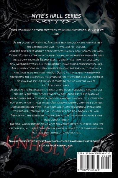 There was never any question-she was mine the moment I laid eyes on her. As the oldest of the Heirs, Adrik has been through a lot and has seen the darkness beyond the walls of Nyte's Hall. Scarred by his past, Adrik's depravity sets him on a collision course with Tierney Foster, a striking woman with a haunting history and an Heiress in her own right. As Tierney seeks to break free from her cruel and domineering boyfriend, she falls into the hands of a possessive stalker. Adrik's intentions may seem sinister to some, but for him, it's the only thing that keeps his sanity intact. Due to his time spent in prison for protecting the one person he loved most in the world; the Sinclair Heir now has no scruples when it comes to taking what he wants. And Adrik wants her... As soon as the Heir clears the path of his biggest obstacle, another one pops up in the form of someone from both their pasts. His plan has already been put into motion, though, and only time will tell if this new player has what it takes to keep Adrik from finishing what he's started. Adrik's obsession with Tierney runs deep, and his ominous intentions toward his little mouse only solidify his decision to own her. Will Tierney find the strength to resist the allure of a man who plays by his own unholy rules? The Heir, who wants nothing more than to possess the Heiress until her last breath, will walk through fire and brimstone to get to her and will fight the devil himself to protect her. No matter what, now that I have her-there's nothing that is going to stop me from keeping her. From Award-Winning Author Stacy Rush comes this dark urban romance, the second installment in the Nyte's Hall Series. *Always check the trigger warning before starting one of my titles *This is an interlinked standalone series. Although reading them in order is best, it isn't necessary.