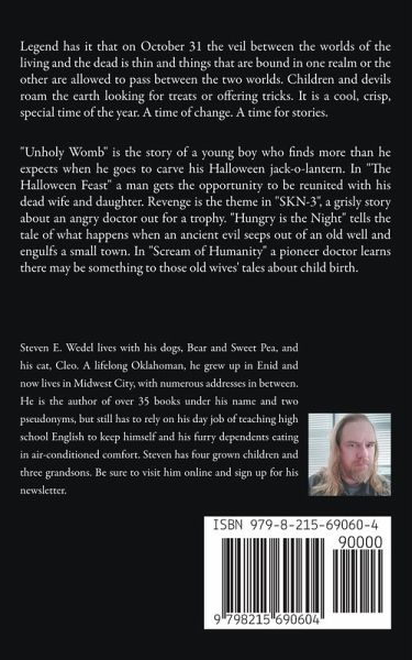 Legend has it that on October 31 the veil between the worlds of the living and the dead is thin and things that are bound in one realm or the other are allowed to pass between the two worlds. Children and devils roam the earth looking for treats or offering tricks. It is a cool, crisp, special time of the year. A time of change. A time for stories. "Unholy Womb" is the story of a young boy who finds more than he expects when he goes to carve his Halloween jack-o-lantern. In "The Halloween Feast" a man gets the opportunity to be reunited with his dead wife and daughter. Revenge is the theme in "SKN-3", a grisly story about an angry doctor out for a trophy. "Hungry is the Night" tells the tale of what happens when an ancient evil seeps out of an old well and engulfs a small town. In "Scream of Humanity" a pioneer doctor learns there may be something to those old wives' tales about child birth.