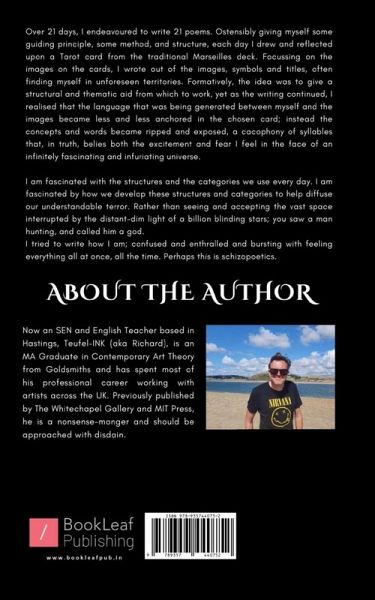 ""Over 21 days, I endeavoured to write 21 poems. Ostensibly giving myself some guiding principle, some method, and structure, each day I drew and reflected upon a Tarot card from the traditional Marseilles deck. Focussing on the images on the cards, I wrote out of the images, symbols and titles, often finding myself in unforeseen territories. Formatively, the idea was to give a structural and thematic aid from which to work, yet as the writing continued, I realised that the language that was being generated between myself and the images became less and less anchored in the chosen card; instead the concepts and words became ripped and exposed, a cacophony of syllables that, in truth, belies both the excitement and fear I feel in the face of an infinitely fascinating and infuriating universe. I am fascinated with the structures and the categories we use every day. I am fascinated by how we develop these structures and categories to help diffuse our understandable terror. Rather than seeing and accepting the vast space interrupted by the distant-dim light of a billion blinding stars; you saw a man hunting, and called him a god. I tried to write how I am; confused and enthralled and bursting with feeling everything all at once, all the time. Perhaps this is schizopoetics.""