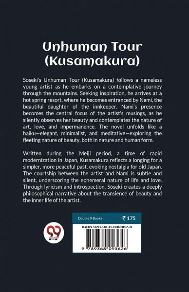 Soseki's Unhuman Tour (Kusamakura) follows a nameless young artist as he embarks on a contemplative journey through the mountains. Seeking inspiration, he arrives at a hot spring resort, where he becomes entranced by Nami, the beautiful daughter of the innkeeper. Nami's presence becomes the central focus of the artist's musings, as he silently observes her beauty and contemplates the nature of art, love, and impermanence. The novel unfolds like a haiku-elegant, minimalist, and meditative-exploring the fleeting nature of beauty, both in nature and human form. Written during the Meiji period, a time of rapid modernization in Japan, Kusamakura reflects a longing for a simpler, more peaceful past, evoking nostalgia for old Japan. The courtship between the artist and Nami is subtle and silent, underscoring the ephemeral nature of life and love. Through lyricism and introspection, S¿seki creates a deeply philosophical narrative about the transience of beauty and the inner life of the artist.