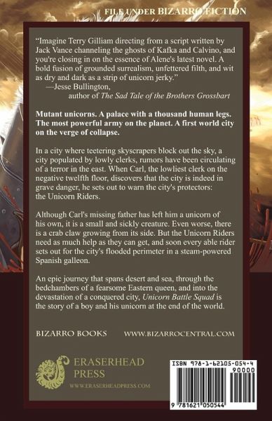 Mutant unicorns. A palace with a thousand human legs. The most powerful army on the planet. A first world city on the verge of collapse. In a city where teetering skyscrapers block out the sky, a city populated by lowly clerks, rumors have been circulating of a terror in the east. When Carl, the lowliest clerk on the negative twelfth floor, discovers that the city is indeed in grave danger, he sets out to warn the city's protectors: the Unicorn Riders. Although Carl's missing father has left him a unicorn of his own, it is a small and sickly creature. Even worse, there is a crab claw growing from its side. But the Unicorn Riders need as much help as they can get, and soon every able rider sets out for the city's flooded perimeter in a steam-powered Spanish galleon. An epic journey that spans desert and sea, through the bedchambers of a fearsome Eastern queen, and into the devastation of a conquered city, Unicorn Battle Squad is the story of a boy and his unicorn at the end of the world.