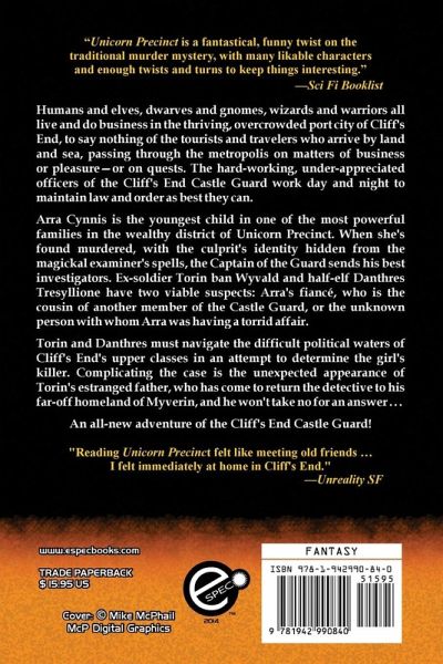 Humans and elves, dwarves and gnomes, wizards and warriors all live and do business in the thriving, overcrowded port city of Cliff's End, to say nothing of the tourists and travelers who arrive by land and sea, passing through the metropolis on matters of business or pleasure-or on quests. The hard-working, under-appreciated officers of the Cliff's End Castle Guard work day and night to maintain law and order as best they can. Arra Cynnis is the youngest child in one of the most powerful families in the wealthy district of Unicorn Precinct. When she's found murdered, with the culprit's identity hidden from the magickal examiner's spells, the Captain of the Guard sends his best investigators. Ex-soldier Torin ban Wyvald and half-elf Danthres Tresyllione have two viable suspects: Arra's fiancé, who is the cousin of another member of the Castle Guard, or the unknown person with whom Arra was having a torrid affair. Torin and Danthres must navigate the difficult political waters of Cliff's End's upper classes in an attempt to determine the girl's killer. Complicating the case is the unexpected appearance of Torin's estranged father, who has come to return the detective to his far-off homeland of Myverin, and he won't take no for an answer . . . . An all-new adventure of the Cliff's End Castle Guard!