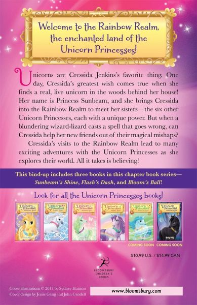Welcome to the Rainbow Realm, an enchanted land ruled by unicorn princesses! Cressida Jenkins, a unicorn-obsessed girl who is sure that unicorns are real, is invited to visit, and readers will be thrilled to journey to the Rainbow Realm along with her! In each story, Cressida is called to help a unicorn princess and her sisters in a magical adventure. This bind-up includes the first three books in this delightful and magicalchapter book series-Sunbeam's Shine, Flash's Dash, and Bloom's Ball .
