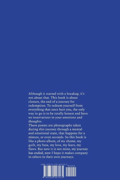 Although it started with a breakup, it's not about that. This book is about closure, the end of a journey for redemption. These poems are photographs taken during this journey through a mental and emotional state, that happens for a minute, or even seconds. So this book is like a photo album, of shame, guilt, hate, love, fears and flaws.