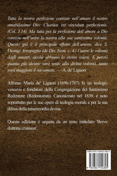Tutta la nostra perfezione consiste nell'amare il nostro amabilissimo Dio: Charitas est vinculum perfectionis. (Col. 3.14). Ma tutta poi la perfezione dell'amore a Dio consiste nell'unire la nostra alla sua santissima volontà. Questo già è il principale effetto dell'amore, dice S. Dionigi Areopagita (de Div. Nom. c. 4.) l'unire le volontà degli amanti, sicchè abbiano lo stesso volere. E perciò quanto più alcuno sarà unito alla divina volontà, tanto sarà maggiore il suo amore. - A. de' Liguori Alfonso Maria de' Liguori (1696-1787) fu un teologo, vescovo e fondatore della Congregazione del Santissimo Redentore (Redentoristi). Canonizzato nel 1839, è noto soprattutto per le sue opere di teologia morale e per la sua difesa della misericordia divina. Questa edizione è seguita da un testo intitolato 'Breve dottrina cristiana'.