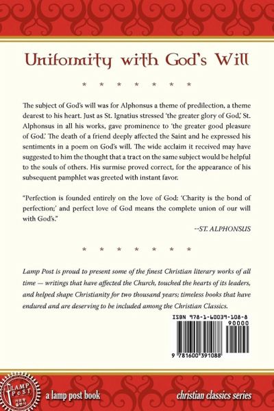 The subject of God's will was for Alphonsus a theme of predilection, a theme dearest to his heart. Just as St. Ignatius stressed 'the greater glory of God,' St. Alphonsus in all his works, gave prominence to 'the greater good pleasure of God.' The death of a friend deeply affected the Saint and he expressed his sentiments in a poem on God's will. The wide acclaim it received may have suggested to him the thought that a tract on the same subject would be helpful to the souls of others. His surmise proved correct, for the appearance of his subsequent pamphlet was greeted with instant favor. "Perfection is founded entirely on the love of God: 'Charity is the bond of perfection;' and perfect love of God means the complete union of our will with God's."--St. Alphonsus. Lamp Post is proud to present some of the finest Christian literary works of all time-writings that have affected the Church, touched the hearts of its leaders, and helped shape Christianity for two thousand years; timeless books that have endured and are deserving to be included among the Christian Classics.