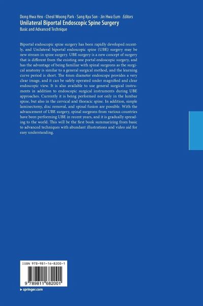 Biportal endoscopic spine surgery has been rapidly developed recently, and Unilateral biportal endoscopic spine (UBE) surgery may be new stream in spine surgery. UBE surgery is a new concept of surgery that is different from the existing one portal endoscopic surgery, and has the advantage of being familiar with spinal surgeons as the surgical anatomy is similar to a general surgical method, and the learning curve period is short. The 4mm diameter endoscope provides a very clear image, and it can be safely operated under magnified and clear endoscopic view. It is also available to use general surgical instruments in addition to endoscopic surgical instruments during UBE approaches. Currently it is being performed not only in the lumbar spine, but also in the cervical and thoracic spine. In addition, simple laminectomy, disc removal, and spinal fusion are possible. With the advancement of UBE surgery, spinal surgeons from various countries have been performing UBE in recent years, and it is gradually spreading to the world. This will be the first book summarizing from basic to advanced techniques with abundant illustrations and video aid for easy understanding.