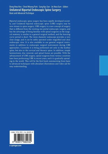 Biportal endoscopic spine surgery has been rapidly developed recently, and Unilateral biportal endoscopic spine (UBE) surgery may be new stream in spine surgery. UBE surgery is a new concept of surgery that is different from the existing one portal endoscopic surgery, and has the advantage of being familiar with spinal surgeons as the surgical anatomy is similar to a general surgical method, and the learning curve period is short. The 4mm diameter endoscope provides a very clear image, and it can be safely operated under magnified and clear endoscopic view. It is also available to use general surgical instruments in addition to endoscopic surgical instruments during UBE approaches. Currently it is being performed not only in the lumbar spine, but also in the cervical and thoracic spine. In addition, simple laminectomy, disc removal, and spinal fusion are possible. With the advancement of UBE surgery, spinal surgeons from various countries have been performing UBE in recent years, and it is gradually spreading to the world. This will be the first book summarizing from basic to advanced techniques with abundant illustrations and video aid for easy understanding.