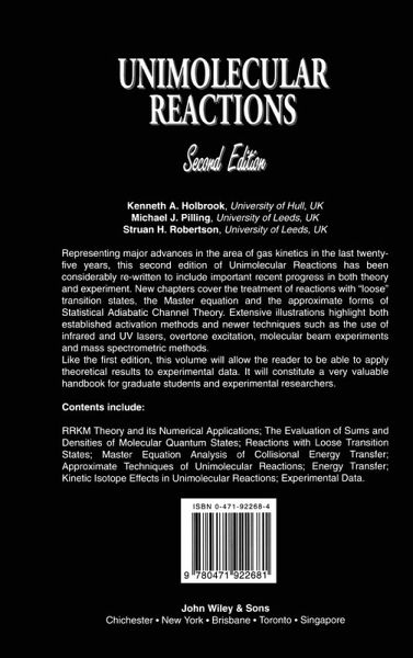 Representing major advances in this area of gas kinetics in the last twenty-five years, Unimolecular Reactions has been considerably rewritten to include important recent progress in both theory and experiment. New chapters cover the treatment of reactions with loose transition states, the Master equation, and the approximate forms of Statistical Adiabatic Channel Theory. Extensive illustrations highlight both established activation methods and newer techniques such as the use of infrared and UV lasers, overtone excitation, molecular beam experiments and mass spectrometric methods.