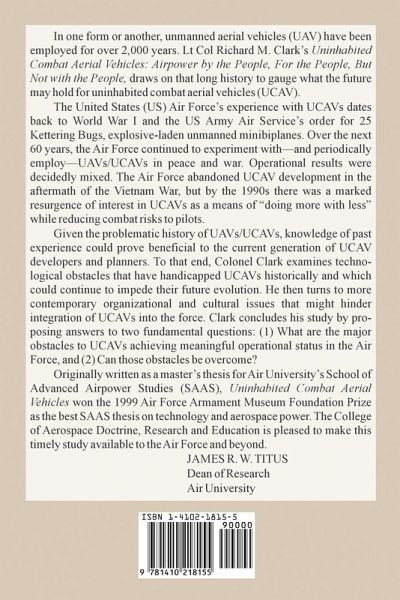 In one form or another, unmanned aerial vehicles (UAV) have been employed for over 2,000 years. Lt Col Richard M. Clark's Uninhabited Combat Aerial Vehicles: Airpower by the People, For the People, But Not with the People, draws on that long history to gauge what the future may hold for uninhabited combat aerial vehicles (UCAV). The United States (US) Air Force's experience with UCAVs dates back to World War I and the US Army Air Service's order for 25 Kettering Bugs, explosive-laden unmanned minibiplanes. Over the next 60 years, the Air Force continued to experiment with-and periodically employ-UAVs/UCAVs in peace and war. Operational results were decidedly mixed. The Air Force abandoned UCAV development in the aftermath of the Vietnam War, but by the 1990s there was a marked resurgence of interest in UCAVs as a means of "doing more with less" while reducing combat risks to pilots. Given the problematic history of UAVs/UCAVs, knowledge of past experience could prove beneficial to the current generation of UCAV developers and planners. To that end, Colonel Clark examines technological obstacles that have handicapped UCAVs historically and which could continue to impede their future evolution. He then turns to more contemporary organizational and cultural issues that might hinder integration of UCAVs into the force. Clark concludes his study by proposing answers to two fundamental questions: (1) What are the major obstacles to UCAVs achieving meaningful operational status in the Air Force, and (2) Can those obstacles be overcome? Originally written as a master's thesis for Air University's School of Advanced Airpower Studies (SAAS), Uninhabited Combat Aerial Vehicles won the 1999 Air Force Armament Museum Foundation Prize as the best SAAS thesis on technology and aerospace power. The College of Aerospace Doctrine, Research and Education is pleased to make this timely study available to the Air Force and beyond. JAMES R. W. TITUS Dean of Research Air University
