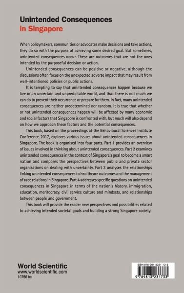 When policymakers, communities or advocates make decisions and take actions, they do so with the purpose of achieving some desired goal. But sometimes, unintended consequences occur. These are outcomes that are not the ones intended by the purposeful decision or action. Unintended consequences can be positive or negative, although the discussions often focus on the unexpected adverse impact that may result from well-intentioned policies or public actions. It is tempting to say that unintended consequences happen because we live in an uncertain and unpredictable world, and that there is not much we can do to prevent their occurrence or prepare for them. In fact, many unintended consequences are neither predetermined nor random. It is true that whether or not unintended consequences happen will be affected by many economic and social factors that Singapore is confronted with, but much will also depend on how we approach these factors and the potential consequences. This book, based on the proceedings at the Behavioural Sciences Institute Conference 2017, explores various issues about unintended consequences in Singapore. The book is organised into four parts. Part 1 provides an overview of issues involved in thinking about unintended consequences. Part 2 examines unintended consequences in the context of Singapore's goal to become a smart nation and compares the perspectives between public and private sector organisations on dealing with uncertainty. Part 3 analyses the relationships linking unintended consequences to healthcare outcomes and the management of race relations in Singapore. Part 4 addresses specific questions on unintended consequences in Singapore in terms of the nation's history, immigration, education, meritocracy, civil service culture and mindsets, and relationships between people and government. This book will provide the reader new perspectives and possibilities related to achieving intended societal goals and building a strong Singapore society.