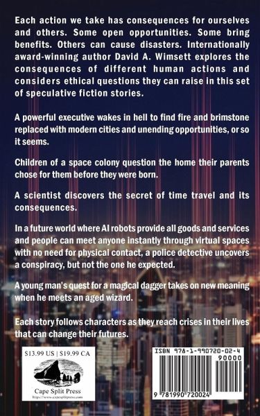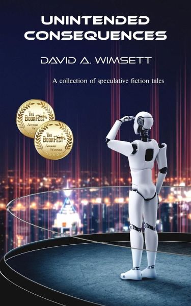 Triple Winner at The BookFest AwardsGold medal for Robots, Computers & AI Gold medal for Space Exploration Silver medal for Sci-Fi Crime & Mystery Each action we take has consequences for ourselves and others. Some open opportunities. Some bring benefits. Others can cause disasters. Internationally award-winning author David A. Wimsett explores the consequences of different human actions and considers the ethical questions they raise in this set of speculative fiction stories.A powerful executive wakes up in hell to find fire and brimstone replaced with modern cities and unending opportunities, until a secret is discovered. Children of a space colony question the home their parents chose for them before they were born. A scientist discovers the secret of time travel and its challenges. In a future world where AI robots provide all goods and services and people can meet anyone instantly through virtual spaces with no need for physical contact, a police detective uncovers a conspiracy, but not the one he expected. A young man's quest for a magical dagger takes on new meaning when he meets an aged wizard. Each tale follows characters as they reach crises in their lives that can change their futures for good or ill. "Unintended Consequences is a well written collection of thought-provoking sci-fi stories that are easily digestible and entertaining. Full of intriguing plot twists and well devised characters, Wimsett's tales are short, succinct and intriguing."- Publishers Weekly BookLife Prize