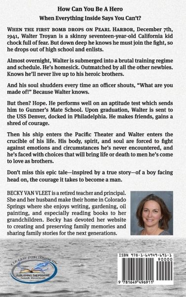 How Can You Be A Hero When Everything Inside Says You Can't? When the first bomb drops on Pearl Harbor, December 7th, 1941, Walter Troyan is a skinny seventeen-year-old California kid chock full of fear. But down deep he knows he must join the fight, so he drops out of high school and enlists. Almost overnight, Walter is submerged into a brutal training regime and schedule. He's homesick. Outmatched by all the other newbies. Knows he'll never live up to his heroic brothers. And his soul shudders every time an officer shouts, "What are you made of!" Because Walter knows. But then? Hope. He performs well on an aptitude test which sends him to Gunner's Mate School. Upon graduation, Walter is sent to the USS Denver, docked in Philadelphia. He makes friends, gains a shred of courage. Then his ship enters the Pacific Theater and Walter enters the crucible of his life. His body, spirit, and soul are forced to fight against emotions and circumstances he's never encountered, and he's faced with choices that will bring life or death to men he's come to love as brothers. Don't miss this epic tale-inspired by a true story-of a boy facing head on, the courage it takes to become a man.