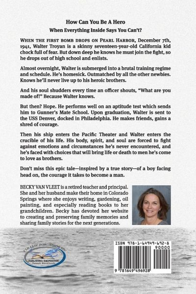 How Can You Be A Hero When Everything Inside Says You Can't? When the first bomb drops on Pearl Harbor, December 7th, 1941, Walter Troyan is a skinny seventeen-year-old California kid chock full of fear. But down deep he knows he must join the fight, so he drops out of high school and enlists. Almost overnight, Walter is submerged into a brutal training regime and schedule. He's homesick. Outmatched by all the other newbies. Knows he'll never live up to his heroic brothers. And his soul shudders every time an officer shouts, "What are you made of!" Because Walter knows. But then? Hope. He performs well on an aptitude test which sends him to Gunner's Mate School. Upon graduation, Walter is sent to the USS Denver, docked in Philadelphia. He makes friends, gains a shred of courage. Then his ship enters the Pacific Theater and Walter enters the crucible of his life. His body, spirit, and soul are forced to fight against emotions and circumstances he's never encountered, and he's faced with choices that will bring life or death to men he's come to love as brothers. Don't miss this epic tale-inspired by a true story-of a boy facing head on, the courage it takes to become a man.