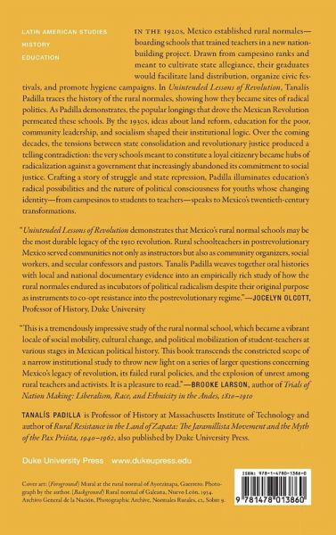 In the 1920s, Mexico established rural normales-boarding schools that trained teachers in a new nation-building project. Drawn from campesino ranks and meant to cultivate state allegiance, their graduates would facilitate land distribution, organize civic festivals, and promote hygiene campaigns. In Unintended Lessons of Revolution, Tanalís Padilla traces the history of the rural normales, showing how they became sites of radical politics. As Padilla demonstrates, the popular longings that drove the Mexican Revolution permeated these schools. By the 1930s, ideas about land reform, education for the poor, community leadership, and socialism shaped their institutional logic. Over the coming decades, the tensions between state consolidation and revolutionary justice produced a telling contradiction: the very schools meant to constitute a loyal citizenry became hubs of radicalization against a government that increasingly abandoned its commitment to social justice. Crafting a story of struggle and state repression, Padilla illuminates education's radical possibilities and the nature of political consciousness for youths whose changing identity-from campesinos, to students, to teachers-speaks to Mexico's twentieth-century transformations.