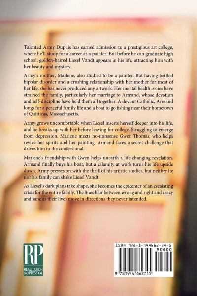 Talented Army Dupuis has earned admission into a prestigious art college. But before he can graduate high school, golden-haired Liesel Vandt appears in his life, attracting him with her beauty and mystery. When she inserts herself deeper into his family life, he grows uncomfortable and breaks up with her. Eager to launch his career as a painter, Army goes off to college and loves his new, art-centered life. The source of Army's talent is his mother, Marlene, who also studied to be a painter. But having battled bipolar disorder and a crushing relationship with her mother for most of her life, she has never produced any work. Struggling to emerge from depression, guilt, and the strain they've had on her marriage and family, Marlene becomes friends with no-nonsense Gwen Thomas. With Gwen's help, she revives her spirits and begins to paint, gaining respect for herself and from others. Army's father, Armand Dupuis, is a devout catholic and the controller at a manufacturing firm. His self-discipline and devotion have held his family together despite the constant challenges of his wife's disorder. He longs for a peaceful life and a small boat for fishing near their maritime hometown of Quitticas, Massachusetts. And he faces a secret that drives him to the confessional. As Marlene's painting takes on new energy, she unearths a life-changing revelation that strains her marriage. Armand finally buys a boat, but a new calamity at work turns his life upside down. Army presses on with the thrill of his artistic studies, but he cannot shake Liesel Vandt. As Liesel's dark plans take shape, she becomes the epicenter of an escalating crisis for the entire family. Army, Marlene and Armand struggle to discern wrong from right and crazy from sane as their lives move in directions they never intended.