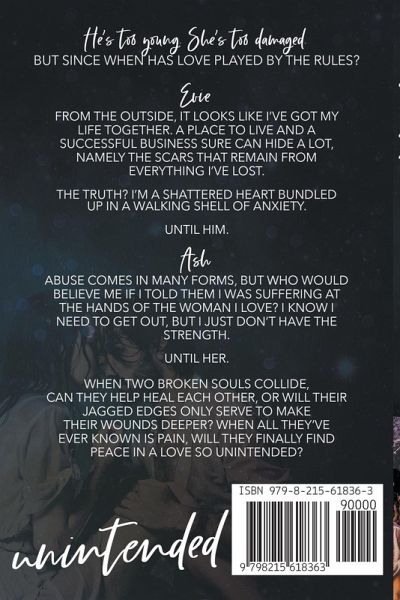 He's too young. She's too damaged. But since when has love played by the rules? Evie From the outside, it looks like I've got my life together. A place to live and a successful business sure can hide a lot, namely the scars that remain from everything I've lost. The truth? I'm a shattered heart bundled up in a walking shell of anxiety. Until him. Ash Abuse comes in many forms, but who would believe me if I told them I was suffering at the hands of the woman I love? I know I need to get out, but I just don't have the strength. Until her. When two broken souls collide, can they help heal each other, or will their jagged edges only serve to make their wounds deeper? When all they've ever known is pain, will they finally find peace in a love so unintended?