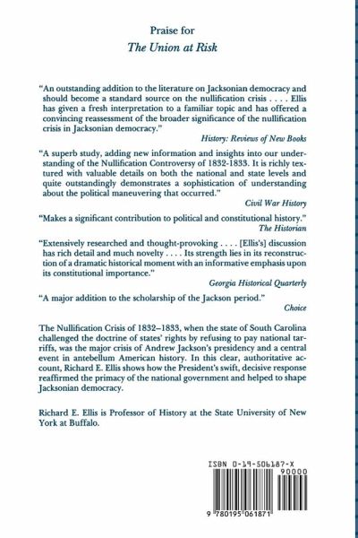 The Nullification Crisis of 1832-33 is undeniably the most important major event of Andrew Jackson's two presidential terms. Attempting to declare null and void the high tariffs enacted by Congress in the late 1820s, the state of South Carolina declared that it had the right to ignore those national laws that did not suit it. Responding swiftly and decisively, Jackson issued a Proclamation reaffirming the primacy of the national government and backed this up with a Force Act, allowing him to enforce the law with troops. Although the conflict was eventually allayed by a compromise fashioned by Henry Clay, the Nullification Crisis raises paramount issues in American political history. The Union at Risk studies the doctrine of states' rights and illustrates how it directly affected national policy at a crucial point in 19th-century politics. Ellis also relates the Nullification Crisis to other major areas of Jackson's administration--his conflict with the National Bank, his Indian policy, and his relationship with the Supreme Court--providing keen insight into the most serious sectional conflict before the Civil War.