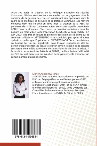 Onze ans après la création de la Politique Etrangère de Sécurité Commune, l'Union européenne a concrétisé son engagement dans le domaine de la gestion de crises en conduisant des opérations dans le cadre de la Politique de Sécurité et de Défense Commune. Les moyens militaires dont elle se dota en 1999 avec la création de la PESD lui permirent de s'affirmer comme un acteur sécuritaire capable de soutenir l'ONU dans ce domaine. Elle connut sa première expérience dans les Balkans en mars 2003, avec l'opération CONCORDIA dans l'ARYM. En juin 2003, elle mit en oeuvre la première opération de ce genre sur le continent africain (« ARTEMIS/RDC ») et conduisit, peu après, d'autres opérations telles que l'opération « EUFOR/TCHAD/RCA ». L'expérience en Afrique fut un pas significatif pour l'Union européenne, elle lui permit d'expérimenter ses capacités sur un terrain lointain et de prendre en charge, de manière autonome, des opérations de gestion de crises. A la lumière des opérations Artémis et EUFOR, ce livre évalue l'efficacité de l'UE en tant qu'acteur du maintien de la paix et tente d'avancer un certain nombre d'enseignements.