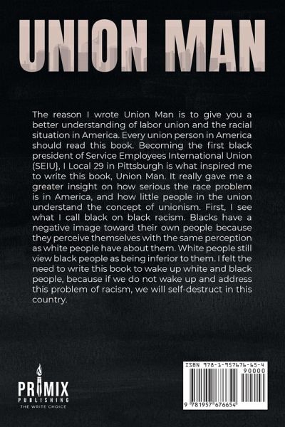 The reason I wrote Union Man is to give you a better understanding of labor union and the racial situation in America. Every union person in America should read this book. Becoming the first black president of Service Employees International Union (SEIU}, I Local 29 in Pittsburgh is what inspired me to write this book, Union Man. It really gave me a greater insight on how serious the race problem is in America, and how little people in the union understand the concept of unionism. First, I see what I call black on black racism. Blacks have a negative image toward their own people because they perceive themselves with the same perception as white people have about them. White people still view black people as being inferior to them. I felt the need to write this book to wake up white and black people, because if we do not wake up and address this problem of racism, we will self-destruct in this country.