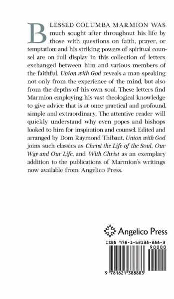 Blessed Columba Marmion was much sought after throughout his life by those with questions on faith, prayer, or temptation; and his striking powers of spiritual counsel are on full display in this collection of letters exchanged between him and various members of the faithful. Union with God reveals a man speaking not only from the experience of the mind, but also from the depths of his own soul. These letters find Marmion employing his vast theological knowledge to give advice that is at once practical and profound, simple and extraordinary. The attentive reader will quickly understand why even popes and bishops looked to him for inspiration and counsel. Edited and arranged by Dom Raymond Thibaut, Union with God joins such classics as Christ the Life of the Soul, Our Way and Our Life, and With Christ as an exemplary addition to the publications of Marmion's writings now available from Angelico Press.