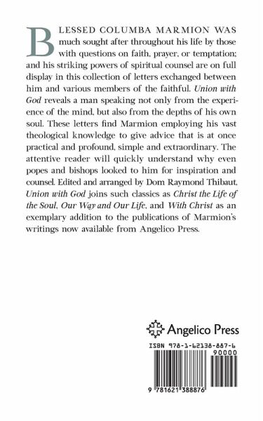 Blessed Columba Marmion was much sought after throughout his life by those with questions on faith, prayer, or temptation; and his striking powers of spiritual counsel are on full display in this collection of letters exchanged between him and various members of the faithful. Union with God reveals a man speaking not only from the experience of the mind, but also from the depths of his own soul. These letters find Marmion employing his vast theological knowledge to give advice that is at once practical and profound, simple and extraordinary. The attentive reader will quickly understand why even popes and bishops looked to him for inspiration and counsel. Edited and arranged by Dom Raymond Thibaut, Union with God joins such classics as Christ the Life of the Soul, Our Way and Our Life, and With Christ as an exemplary addition to the publications of Marmion's writings now available from Angelico Press.