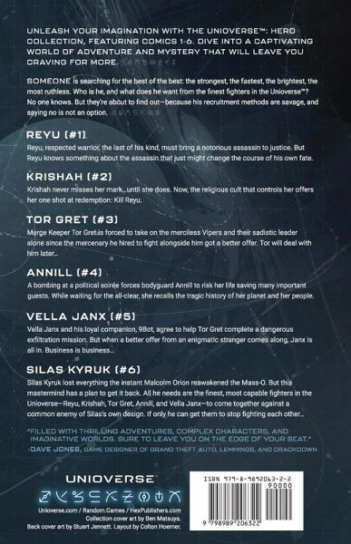 Unioverse: Hero Collection Comics 1-6 Someone is searching for the best of the best: the strongest, the fastest, the brightest, the most ruthless. Who is he, and what does he want from the finest fighters in the Unioverse? No one knows. But they're about to find out-because his recruitment methods are savage, and saying no is not an option. ¿¿¿¿¿¿¿Issue 1: Reyu Reyu, respected warrior, the last of his kind, must bring a notorious assassin to justice. But Reyu knows something about the assassin that just might change the course of his own fate. Issue 2: Krishah Krishah never misses her mark...until she does. Now, the religious cult that controls her offers her one shot at redemption: Kill Reyu. Issue 3: Tor Gret Merge Keeper Tor Gret is forced to take on the merciless Vipers and their sadistic leader alone since the mercenary he hired to fight alongside him got a better offer. Tor will deal with him later... Issue 4: Annill A bombing at a political soirée forces bodyguard Annill to risk her life saving many important guests. While waiting for the all-clear, she recalls the tragic history of her planet and her people. Issue 5: Vella Janx Vella Janx and his loyal companion, 9Bot, agree to help Tor Gret complete a dangerous exfiltration mission. But when a better offer from an enigmatic stranger comes along, Janx is all in. Business is business... Issue 6: Silas Kyruk Silas Kyruk lost everything the instant Malcolm Orion reawakened the Mass-O. But this mastermind has a plan to get it back. All he needs are the finest, most capable fighters in the Unioverse-Reyu, Krishah, Tor Gret, Annill, and Vella Janx-to come together against a common enemy of Silas's own design. If only he can get them to stop fighting each other...
