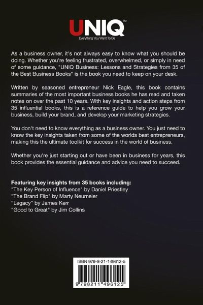 As a business owner, it's not always easy to know what you should be doing. Whether you're feeling frustrated, overwhelmed, or simply in need of some guidance, "UNIQ Business: Lessons and Strategies from 35 of the Best Business Books" is the book you need to keep on your desk. Written by seasoned entrepreneur Nick Eagle, this book contains summaries of the most important business books he has read and taken notes on over the past 10 years. With key insights and action steps from 35 influential books, this is a reference guide to help you grow your business, build your brand, and develop your marketing strategies. You don't need to know everything as a business owner. You just need to know the key insights taken from some of the worlds best entrepreneurs, making this the ultimate toolkit for success in the world of business. Whether you're just starting out or have been in business for years, this book provides the essential guidance and advice you need to succeed. Featuring key insights from 35 books including: "The Key Person of Influence" by Daniel Priestley "The Brand Flip" by Marty Neumeier "Legacy" by James Kerr "Good to Great" by Jim Collins