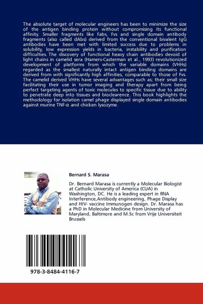 The absolute target of molecular engineers has been to minimize the size of the antigen binding protein without compromising its functional affinity. Smaller fragments like Fabs, Fvs and single domain antibody fragments (also called dAbs) derived from the conventional bivalent IgG antibodies have been met with limited success due to problems in solubility, low expression yields in bacteria, instability and purification difficulties. The discovery of functional heavy chain antibodies devoid of light chains in camelid sera (Hamers-Casterman et al., 1993) revolutionized development of platforms from which the variable domains (VHHs) regarded as the smallest naturally intact antigen binding domains are derived from with significantly high affinities, comparable to those of Fvs. The camelid derived VHHs have several advantages such as; their small size facilitating their use in tumor imaging and therapy apart from being perfect targeting agents of toxic molecules to specific tissue due to ability to penetrate deep into tissues and bioclearence. This book highlights the methodology for isolation camel phage displayed single domain antibodies against murine TNF- and chicken lysozyme.