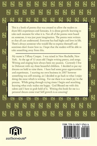 This is a book of poems that was created to allow the readers to share life's experiences and fantasies. It is about growth: learning to take each moment for what it is. Not all of the poems were based on someone, it was just pure imagination. The poems were written so that all can understand. Everyone has had highs and lows in life. There's always someone who would like to express themself and somtimes don't know how to. I hope that the readers will be able to take something away from this.