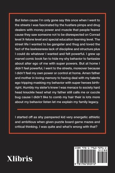 But listen cause I'm only gone say this once when I went to the streets I was fascinated by the hustlers pimps and drug dealers with money power and muscle that people feared cause they saw someone not to be disrespected on Conrad level X-felone level and special education learning level. The street life I wanted to be gangster and thug and loved the fact of the lawlessness lack of discipline and structure plus I could do whatever I wanted and felt powerful. I grew up marvel comic book fan to hide my shy behavior to fantasize about alter ego of me with super powers. But at home I didn't feel powerful, I went to the streets, moreover because I didn't feel my own power or control at home. Amen father and mother in loving memory to having deal with my talents ego tripping masking my behavior with super heroes birth-right. Humbly my sister's knew I was menace to society hard head knuckle head what my father still calls me or cuccle bug cause I didn't like to comb my hair their is lots more about my behavior listen let me explain my family legacy.