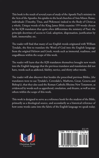This book is the result of several years of study of the Apostle Paul's ministry in the Acts of the Apostles, his epistles to the local churches of Asia Minor, Rome, individuals (Timothy, Titus, and Philemon) indeed to the Body of Christ as a whole. Unique words of the King James Bible examine 199 words chosen by the KJB translators that quite often differentiate the ministry of Paul, the principle doctrines of access to God, adoption, dispensation, justification by faith, immortality, etc. The reader will find that many of our English words originated with William Tyndale, the first to translate the Word of God into the English language from the original Hebrew and Greek, words such as immortal, readiness, and ungodliness within the scope of this work. The reader will learn that the KJB translators themselves brought new words into the English language that the previous translator and translations did not have, words such as addicted, fidelity, novice, and thirty other words. The reader will also discover that besides the prescribed previous Bibles,(the translators were to use Tyndale's, Coverdale's, Matthews, Great, Geneva and Bishop's), that they also used the Roman Catholic Rheims New Testament, as evidenced by words such as apprehend, emulation, and theatre, as well as nine others within the scope of this work. This work is designed to serve as a reference book for the student of the Bible, primarily as a theological source, and secondarily as a historical reference of how some words came into the fabric of the English language we speak today.