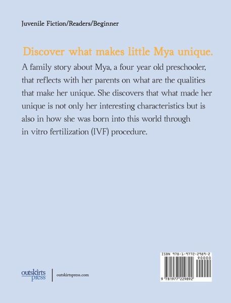 A family story about Mya, a 4 year old preschooler, that reflects with her parents on what are the qualities that make her unique. She discovers that what made her unique is not only her interesting characteristics but is also in how she was born into this world through in vitro fertilization (IVF) procedure.