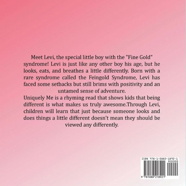 Meet Levi, the special little boy with the "Fine Gold" syndrome! Levi is just like any other boy his age, but he looks, eats, and breathes a little differently. Born with a rare syndrome called the Feingold Syndrome, Levi has faced some setbacks but still brims with positivity and an untamed sense of adventure. Uniquely Me is a rhyming read that shows kids that being different is what makes us truly awesome. Through Levi, children will learn that just because someone looks and does things a little different doesn't mean they should be viewed any differently.