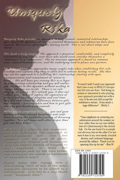 This is NOT your typical D/s manual. Uniquely Rika provides a practical, intelligent, common-sense approach to adding D/s to your relationship; with long-termed success. You'll see how fulfilling the inner desire to serve or be served is within your reach - without having to mask yourself in artificial roles and games. Ms. Rika explains why several popular approaches fail to last. She then details her approach to creating successful D/s relationships; one which has proven as effective with seasoned D/s players as with those who never thought themselves to be a 'dominant' or 'submissive'. Regardless of your experience level, Uniquely Rika will provide a new insight, a heightened awareness, and a fresh perspective on D/s that will enhance your relationships, forever. Though written from the 'female-led' perspective, the concepts are applicable to any loving partners. If you're serious about a lasting and meaningful D/s-based relationship, you'll want to read "Uniquely Rika".