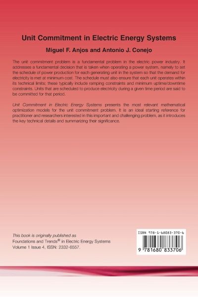 The unit commitment problem is a fundamental problem in the electric power industry. It addresses a fundamental decision that is taken when operating a power system, namely to set the schedule of power production for each generating unit in the system so that the demand for electricity is met at minimum cost. The schedule must also ensure that each unit operates within its technical limits; these typically include ramping constraints and minimum uptime/downtime constraints. Units that are scheduled to produce electricity during a given time period are said to be committed for that period. Unit Commitment in Electric Energy Systems presents the most relevant mathematical optimization models for the unit commitment problem. It is an ideal starting reference for practitioner and researchers interested in this important and challenging problem, as it introduces the key technical details and summarizing their significance.