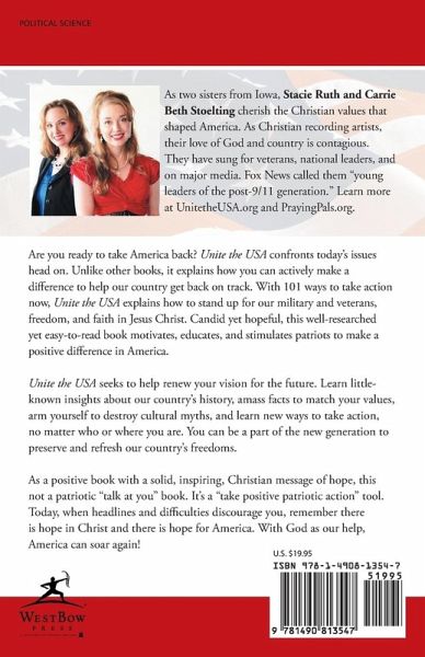 Are you ready to take America back? Unite the USA confronts today's issues head on. Unlike other books, it explains how you can actively make a difference to help our country get back on track. With 101 ways to take action now, Unite the USA explains how to stand up for our military and veterans, freedom, and faith in Jesus Christ. Candid yet hopeful, this well-researched yet easy-to-read book motivates, educates, and stimulates patriots to make a positive difference in America. Unite the USA seeks to help renew your vision for the future. Learn little-known insights about our country's history, amass facts to match your values, arm yourself to destroy cultural myths, and learn new ways to take action, no matter who or where you are. You can be a part of the new generation to preserve and refresh our country's freedoms. As a positive book with a solid, inspiring, Christian message of hope, this not a patriotic "talk at you" book. It's a "take positive patriotic action" tool. Today, when headlines and difficulties discourage you, remember there is hope in Christ and there is hope for America. With God as our help, America can soar again!