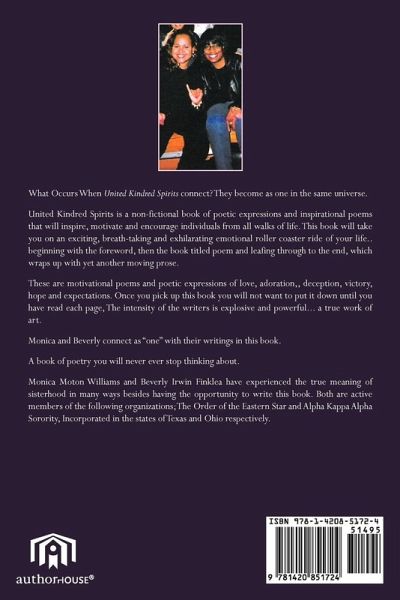 What Occurs When United Kindred Spirits connect? They become as one in the same universe. United Kindred Spirits is a non-fictional book of poetic expressions and inspirational poems that will inspire, motivate and encourage individuals from all walks of life. This book will take you on an exciting, breath-taking and exhilarating emotional roller coaster ride of your life.. beginning with the foreword, then the book titled poem and leafing through to the end, which wraps up with yet another moving prose. These are motivational poems and poetic expressions of love, adoration,, deception, victory, hope and expectations. Once you pick up this book you will not want to put it down until you have read each page, The intensity of the writers is explosive and powerful... a true work of art. Monica and Beverly connect as "one" with their writings in this book. A book of poetry you will never ever stop thinking about.