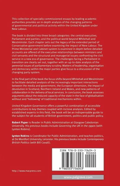 This replacement volume for Governing in the UK in the 1990s brings together specially-commissioned chapters by leading authorities to form an accessible and comprehensive introductory text. The legacy of eighteen years of Conservative Government is fully analysed and the agenda and impact of New Labour stringently evaluated. This stimulating book will inform and guide students on the state of governance in the UK at the start of the new millennium.