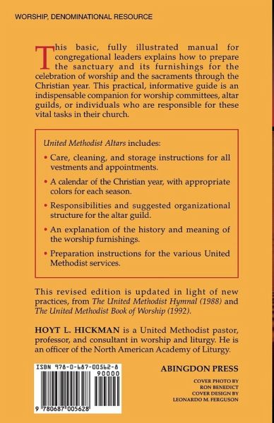 This basic, fully illustrated manual for congregational leaders explains how to prepare the sanctuary and its furnishings for the celebration of worship and sacraments throughout the Christian year. This practical, informative guide is an indispensable companion for worship committees, altar guilds, or individuals whose responsible for these vital tasks in their church. United Methodist Altars includes: care, cleaning, and storage instructions for all vestments and appointments; a calendar of the Christian year, with appropriate colors for each season; responsibilities and suggested organizational structure for the altar guild; an explanation of the history and meaning of worship furnishings; preparation instructions for the various United Methodist services; and, a glossary.
