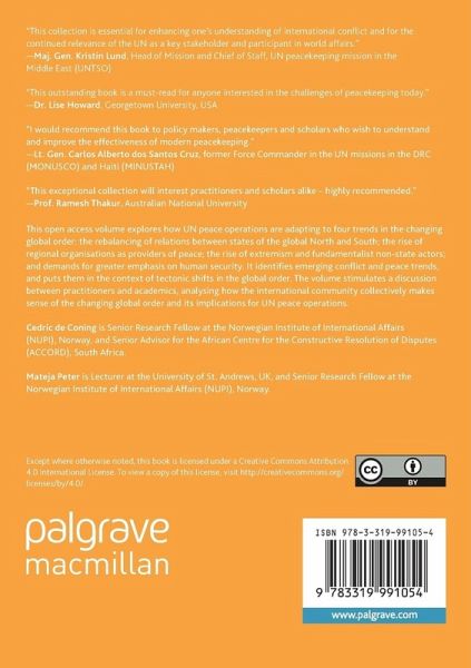 This open access book explores how UN peace operations are adapting to four transformational trends in the changing global order: (1) the rebalancing of relations between states of the global North and the global South; (2) the rise of regional organisations as providers of peace; (3) the rise of violent extremism and fundamentalist non-state actors; and (4) increasing demands from non-state actors for greater emphasis on human security. It identifies emerging conflict and peace trends (robustness of responses, rise of non-state threats, cross-state conflicts) and puts them in the context of tectonic shifts in the global order (rise of emerging powers, North-South rebalancing, emergence of regional organisations as providers of peace). The volume stimulates a discussion between practitioners and academics from the global North and South, and offers an analysis of how the international community collectively makes sense of the changing global order and its implications for UN peace operations.