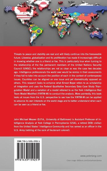 Threats to peace and stability are real and will likely continue into the foreseeable future. Likewise, globalization and its proliferation has made it increasingly difficult in knowing whether one is a friend or foe. This is particularly true when turning to the relationship of the five permanent members of the United Nations Security Council (UNSC); the relationships are not as clear as was the case two decades ago. Intelligence professionals the world over would be remiss in their assessments if they fail to take into account the position of each in the context of contemporary issues. Countries can be aligned on one issue and yet diametrically opposed on others. This research looks to enhance what Ernest Boyer refers to as scholarship of integration and uses the Federal Qualitative Secondary Data Case Study Triangulation Model and a variation of a model referred to as the York Intelligence Red Team Model-Modified (YIRTM-M) to conduct the analysis. More pointedly, this booklooks at issues from the U.S. perspective to see how the YIRTM-M can be applied to advance its own interests on the world stage and to better understand when each can be seen as a friend or foe.