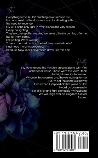 Dark Mafia Romance Theo Everything we've built is crashing down around me. I'm consumed by the darkness, my blood boiling with the need for revenge. My wife is the only light in my life; she's the very reason I keep on fighting. They're coming after me. And worse yet, they're coming after her. But let them come... I'm waiting. We're waiting. To send them all back to the hell they crawled out of. I just hope the city's prepared. Because New York's never seen a war like this one. Holly My life changed the minute I crossed paths with him. For better or worse. Those were the vows I took. And right now, it's for worse... Whoever his enemies are, they're looking for me. But I'm not the same wallflower I was when I stepped off that plane at JFK. I won't go down easily. No, I'll stay and fight alongside my husband. We will reign over his kingdom. United. As one.
