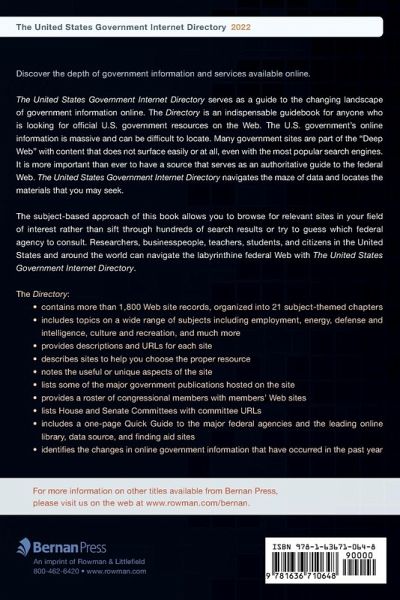 The United States Government Internet Directory serves as a guide to the changing landscape of government information online. The Directory is an indispensable guidebook for anyone who is looking for official U.S. government resources on the Web.
