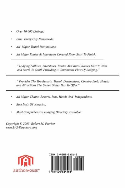 The United States Lodging Directory. Includes Hotels, Resorts, Country Inn's, Resort Ski Towns, Golf Communities And Beach Front Communities. All The National Parks With Listings For Each Community In And Around The Park Areas. Carries Over 40 Of The Top National Lodging Carriers, Top Independent Resorts, America's Bed And Breakfast Association, National Innkeepers Of America, Resort Ski Villages And The Top Ski Resorts In The Country. Ranches And Resort Golf Communities. The United States Lodging Directory Is Indexed By State, Interstate And Rural Routes. Listings Follow Interstates, Routes And Rural Routes For Each State Providing Accomodations For Every City And Town Nationwide. United States Lodging Directory Contains Over 10,000 Toll Free Listings Download The PDF Acrobate Reader At www.u-s-directory.com